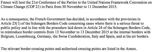 Anabaḍ (lḥukuma) n Fṛansa la d-yessewjad ad yeḥṛes taɛessast ɣef tlisa-nnes i tallit n wayyur, deg wakud-nni aydeg ad yili Usarag Agraɣlan ɣef Unezwu (climat) deg Paris. Aḥezzib-a yettwaddem « deg tegnit aydeg yella umihi d ameqran i tɣellist tanagdudt (sécurité publique) d tin n daxel tmurt ». Maca, la d-yettban dakken iswi netta d argal n ubrid i tmetti taɣarimt (société civile) akken ur tettewliwil ara, dɣa aṭas seg tmagliwin (délégations) ad d-yasen seg tmura n unẓul (sud) mlalent-d uguren akken ad tent-id-tṣaḥ lviza.