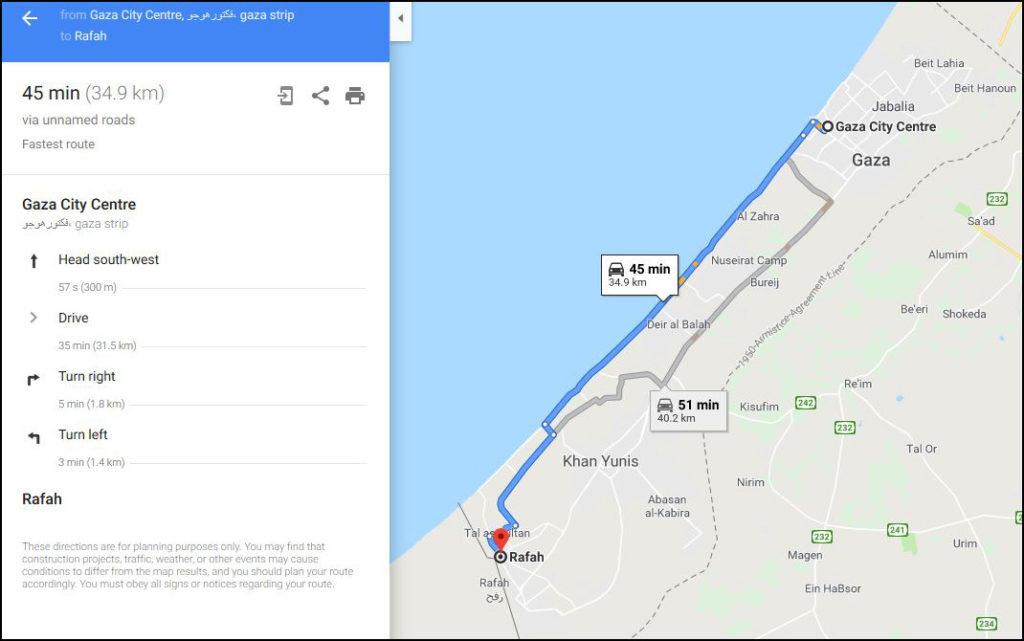 L’anomalia di Google, e indizio della sua follia, è Gaza. Anche se non occorre dire che Google si rifiuta di collegare Gaza con il mondo esterno, Google è perfettamente disposto a guidare le persone catturate all’interno di quella “prigione”. L’ovvia ragione è che al momento non ci sono ancora insediamenti israeliani a Gaza. E così Google mapperà le strade che collegano le principali città di Gaza, come Gaza City a nord e Rafah a sud, o luoghi più piccoli come Al Qarara e Nuseirat Camp.