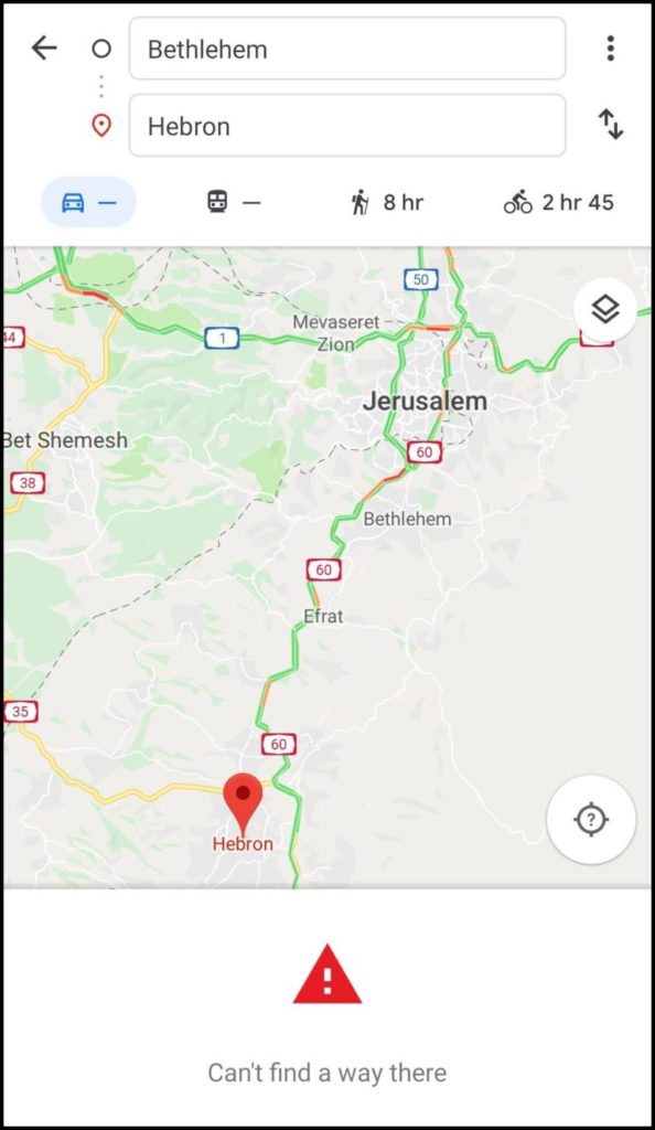 Abu Dis è un’affollata città universitaria palestinese vicina a Gerusalemme; il gigante tecnologico Google, tuttavia, “non riesce a trovare una strada lì”, da nessuna parte. Ma nelle vicinanze di Abu Dis si trova l’insediamento israeliano di Ma’ale Adumin, che non è un problema per Google, non importa da dove tu parta – sia Londra o Città del Capo.
