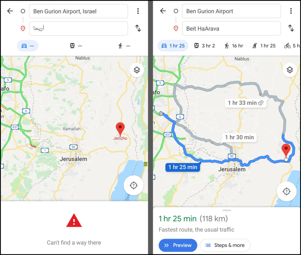 Google “non riesce a trovare una strada” per Gerico, una città iconica nella civiltà umana (a sinistra). Ciononostante, trova istantaneamente tre percorsi per il vicino insediamento israeliano di Beit HaArava (a destra)