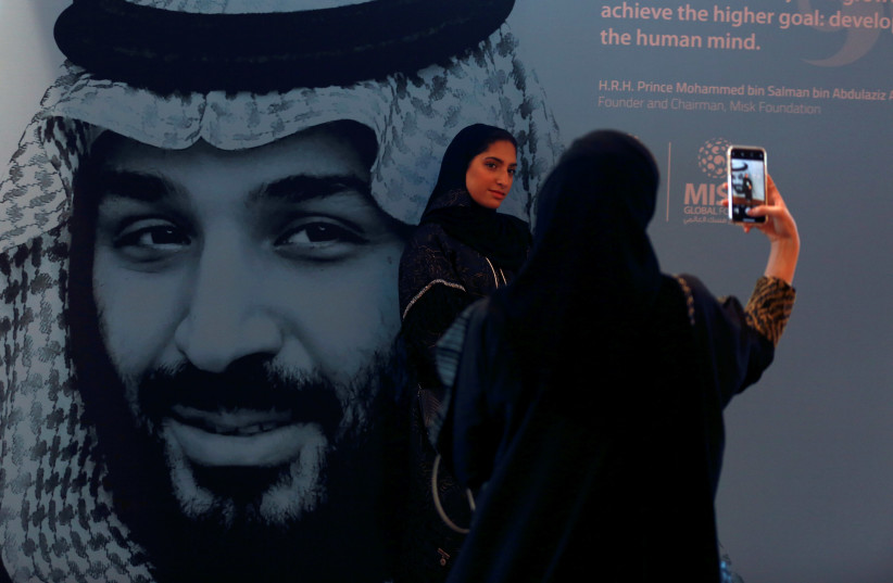 Participants take photos next to a picture of Saudi Crown Prince Mohammed bin Salman during the Misk Global Forum in Riyadh, Saudi Arabia